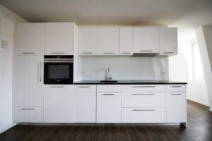 - Moderne Küche in weiss hochglanz mit Stauraum und Platz zum Essen
